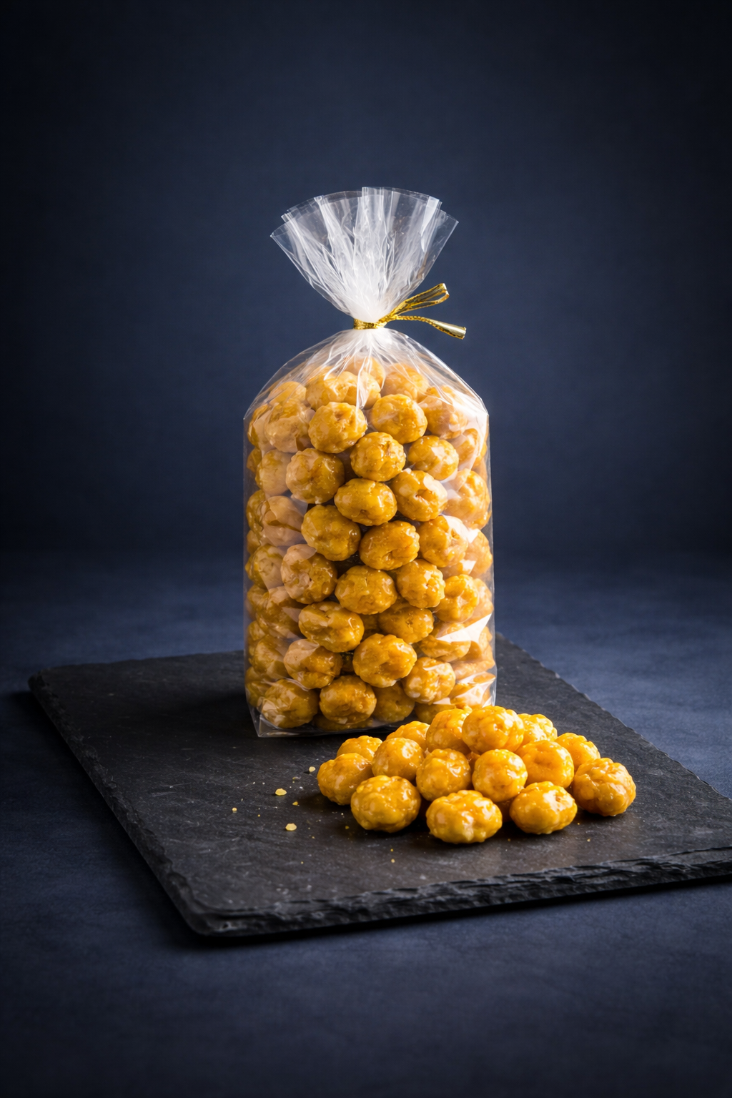 Ces pépites gourmandes, cachent une douceurs irrésistible: un enrobage de chocolat blanc à la fleur de sel, saveur caramel, renfermant un cœur croustillant de riz soufflé.
